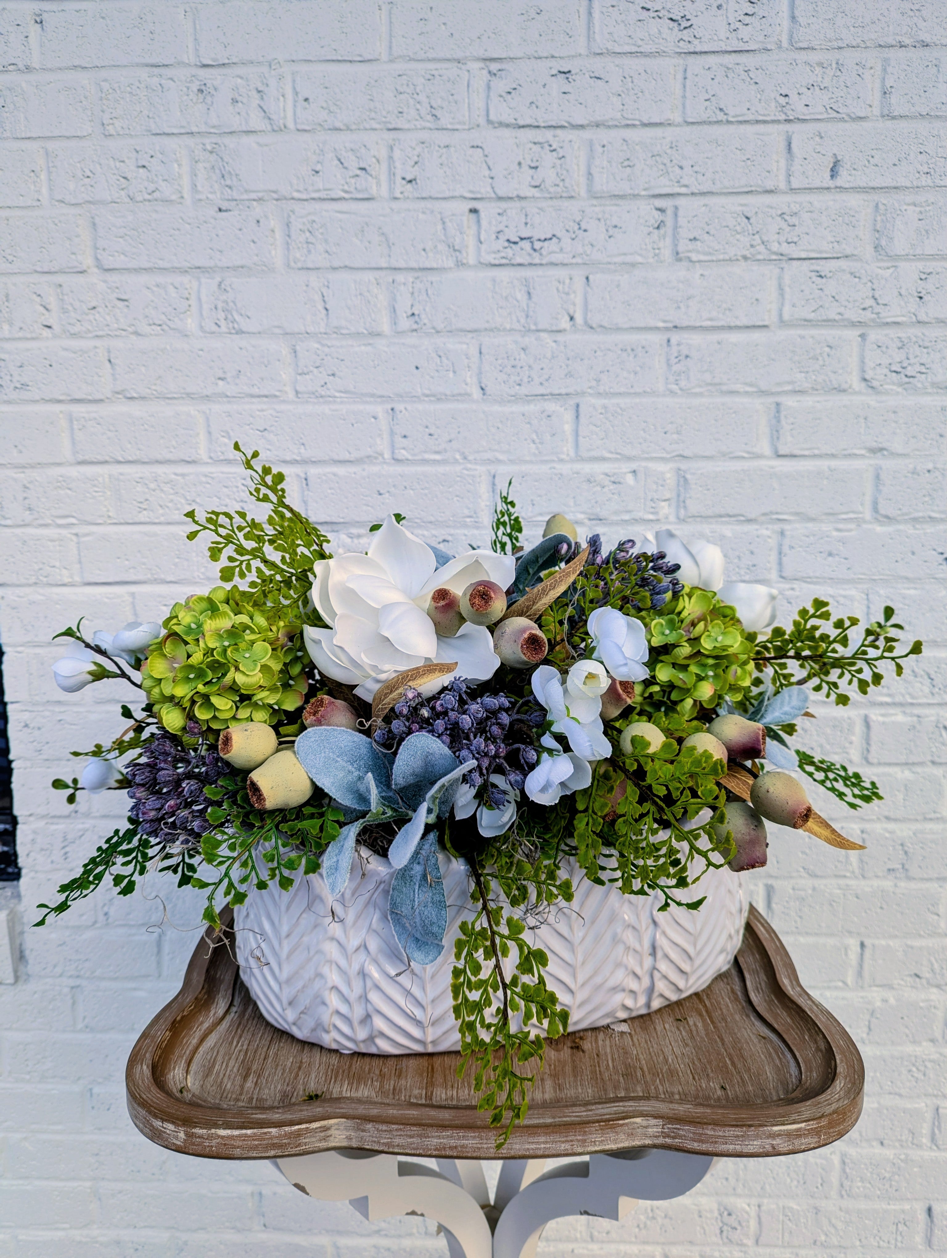 Bring timeless southern charm into your home with this springtime magnolia potted arrangement. Crisp blues and whites evoke classic elegance, perfect for creating a welcoming atmosphere in any room. A graceful accent piece that captures the essence of seasonal beauty and refined taste.