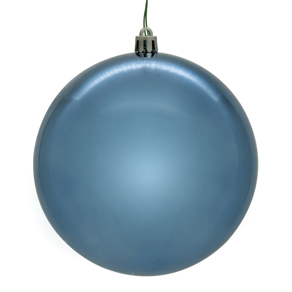 Vickerman 10" Denim Blue Shiny Ball Ornament. This ornament features a shiny finish that will add gloss to any holiday decorating project. This item is made from shatterproof and UV resistant plastic for extended protection from fading and breaking.