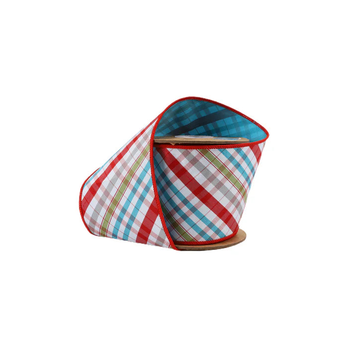 4" Wired Taffeta Ribbon | Red/Turquoise/Apple Green/White Plaid Bias Cut Double-Fused w/ Turquoise Backing | 10 Yard Roll
