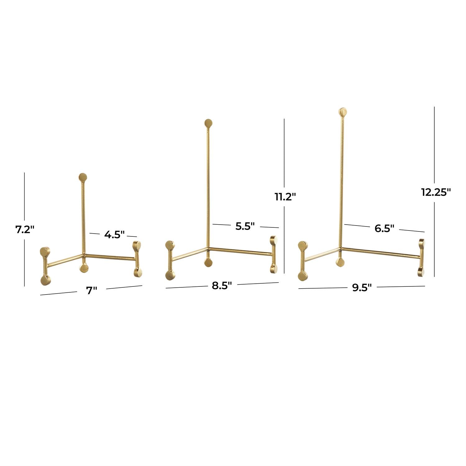 Each gold metal easel measures 9.5L x 6.5W x 12.25H , 8.5L x 5.5W x 11.2H, 7L x 4.5W x 7.2H inches