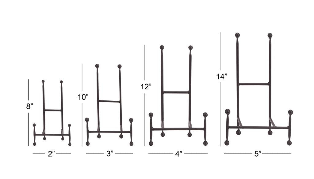 Each black metal easel measures 2L x 5W x 8H , 3L x 6W x 10H , 4L x 8W x 12H , 5L x 9W x 14H inches