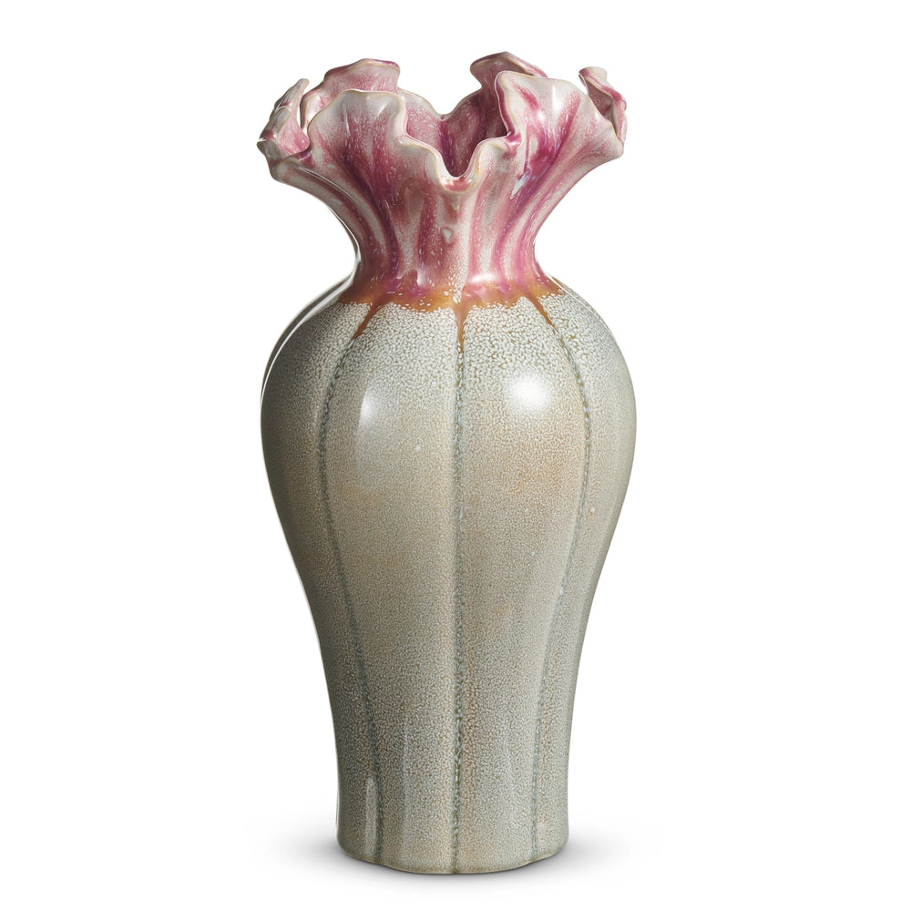 Pink Ruffle Speckled Vase Bring soft elegance to any room with this charming vase. Perfect for fresh or dried arrangements, this piece works beautifully on shelves, mantels, or side tables as a standalone statement. 13.5" H by Raz Imports