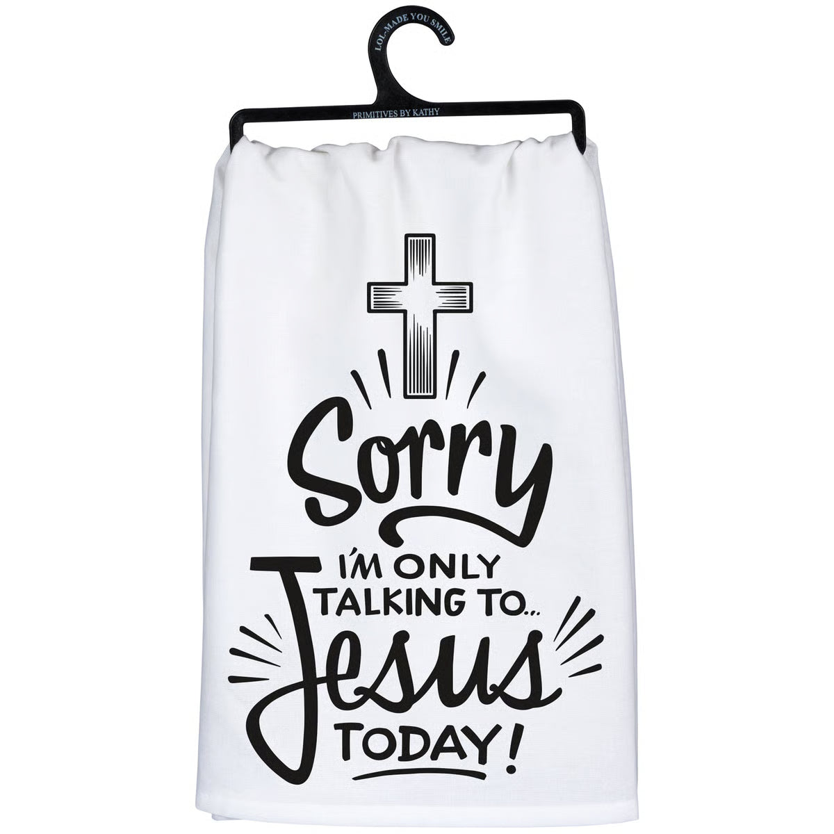 A black and white cotton kitchen towel displaying a fun hand illustrated design of a cross above a humorous faith inspired sentiment that reads "Sorry I'm Only Talking To Jesus Today!" Our Talking To Jesus Today kitchen towel is conveniently machine-washable for easy cleaning. Funny kitchen towel is packaged on a black plastic hanger to easily display on rack. A fun faith-themed gift perfect for an everyday kitchen accessory.
