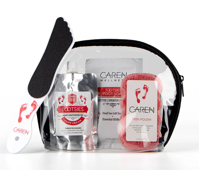 All the Things Your Feet will Love! This Gift Set includes 2 oz Foot Soak, 3 oz Foot Cream, Best Selling Pedi Polish Soap Sponge and a 10" Foot File all wrapped up in an Extra Large travel bag. A Great Gift for Everyone!