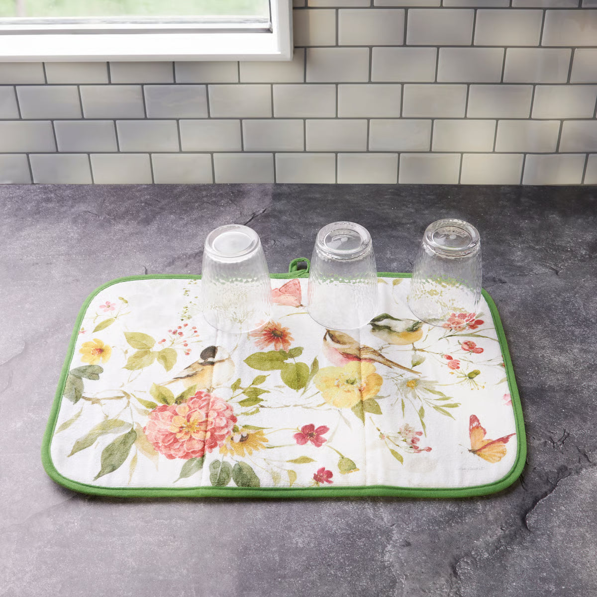 Bring warm charm to your kitchen with this charming Chickadee Drying Mat. Featuring a delightful bird design, this absorbent mat protects countertops while adding a touch of nature-inspired style to your home decor. Perfect for drying dishes, glasses, and cookware. Machine washable for easy care and long-lasting use.