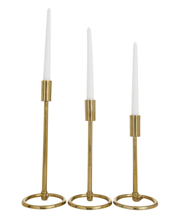 Each piece in this aluminum set of 3 candle holders features a tall, tapered pillar extending to a round looped base stand that flaunts a modern look