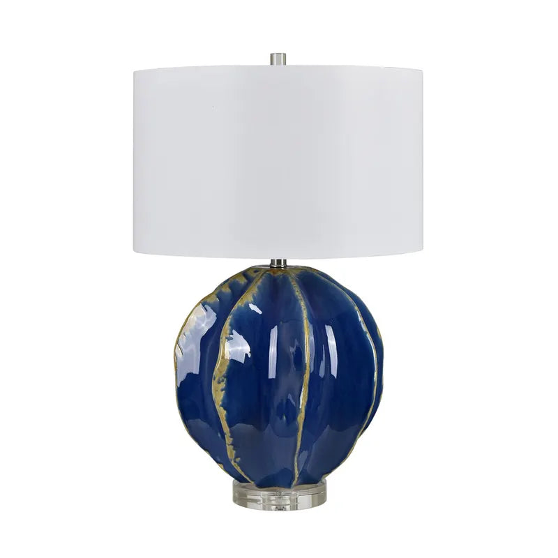 The Renwill Table Lamp boasts a deep cobalt glaze that beautifully highlights its distinctive scalloped shape. This artisanal, handcrafted piece is topped with a white linen shade, offering a unique yet versatile addition to any decor. Perfect for adding a bold yet refined touch to your space.