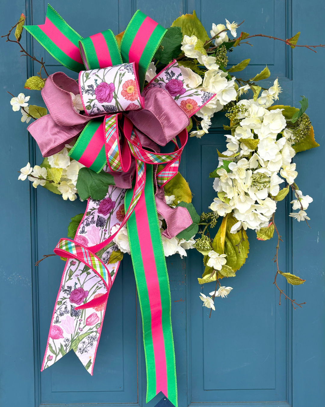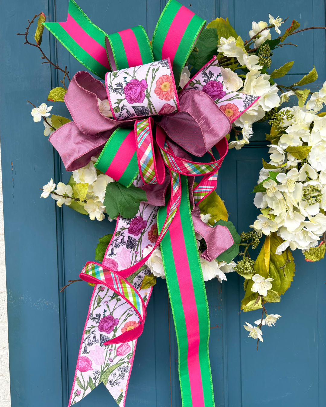 A calming & colorful spring bow for a more sophisticated, personality-filled look. Made from a one-of-a-kind combination of our soft lilac, bold hot pink and green stripe, wildflower and pink spring plaid ribbons,