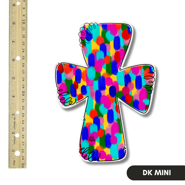Make a statement with the Stained Cross Mini! This Mini is a charming wooden design featuring a fun and colorful print.