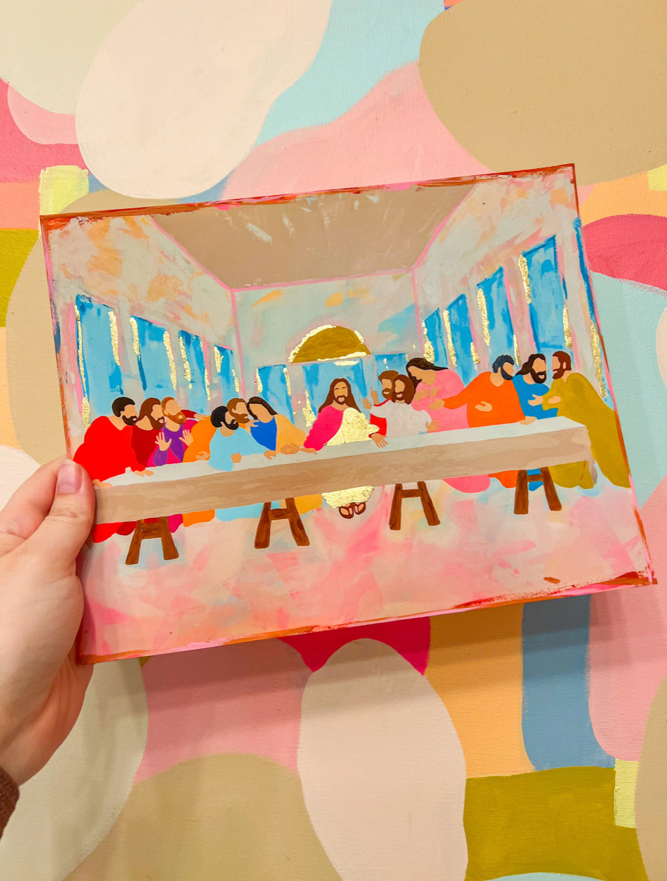 Bring color, joy, and sacred storytelling into your home with this modern, hand-painted interpretation of The Last Supper. Layers of lively pinks, blues, and warm tones create a fresh, uplifting take on a timeless scene. Each piece is finished with delicate gold-leaf accents that catch the light beautifully and add a touch of luxury.