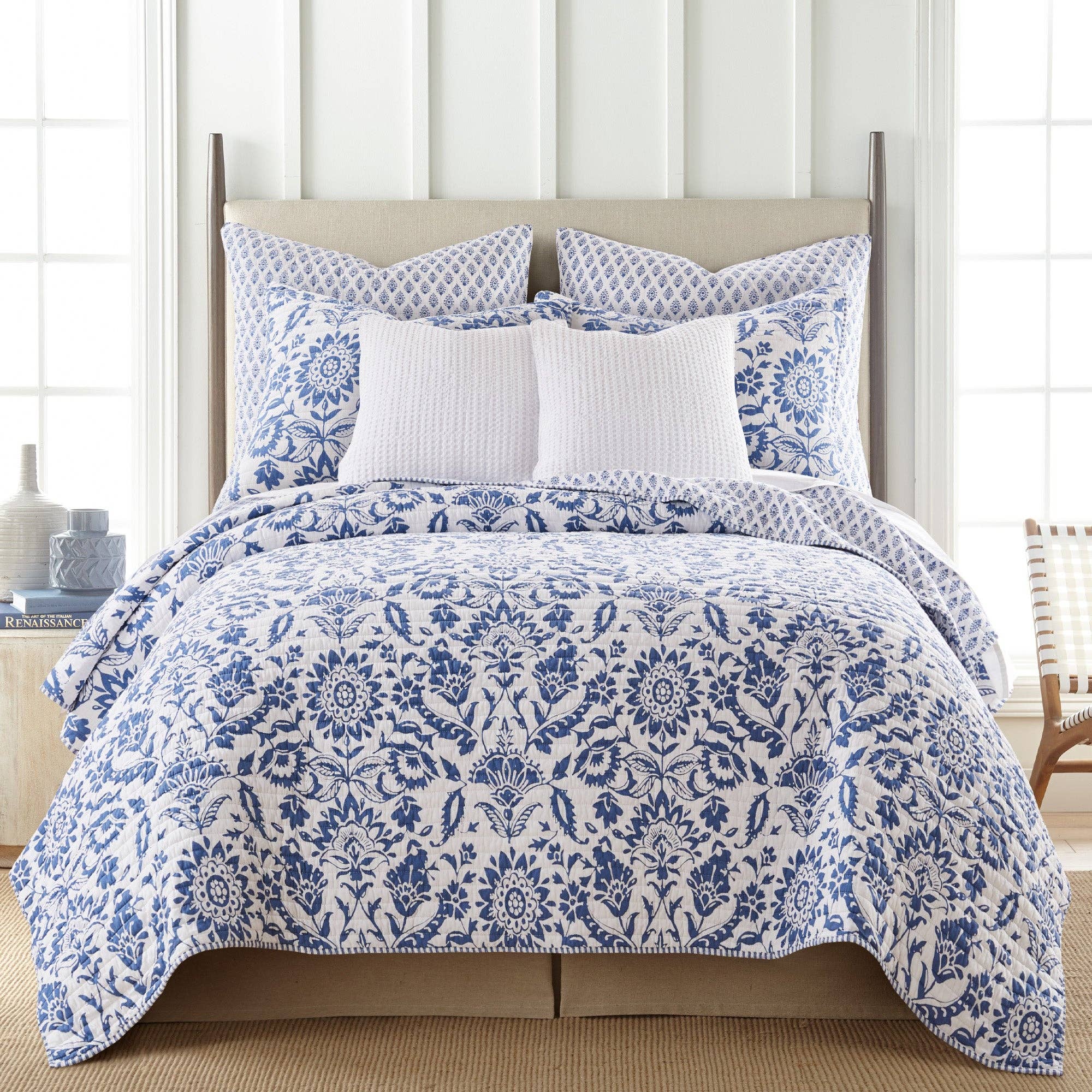 The Clara Blue Reversible Quilt Set is inspired by antique chic wallcoverings. Offered in classic blue and white, this design will immediately transform your bedroom. This reversible quilt features an array of flowers and vines on the front, reversing to a small blue geometric medallions on white on the back. The Quilt Set has a cotton front and back, filled with a cotton-rich filler, and is machine washable. Enjoy this for years to come!