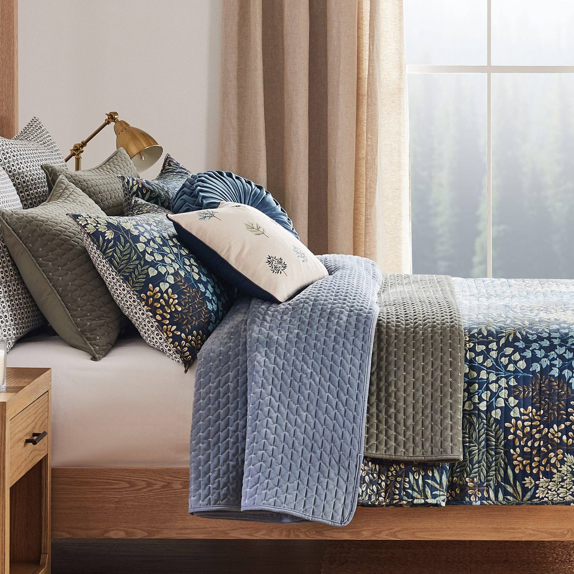 The English Forest Reversible Quilt Set by Levtex Home is inspired by a lush arboreal forest. Offered in various color schemes, this design will immediately transform your bedroom. This reversible quilt features a modern botanical print on the front, with each color selection its own unique reverse pattern. Navy: Rayon front and cotton back, reverses to a small floral geo pattern in navy and cream.