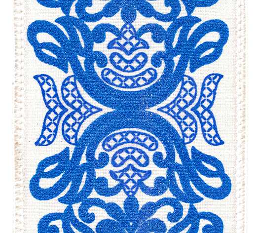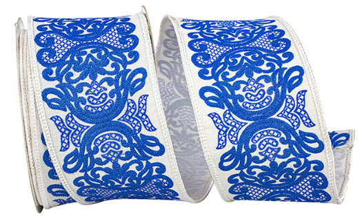 An ornate blue filigree design is printed on a pure white background. The dupioni fabric adds to the elegant nature of this wired ribbon. Ideal for a variety of floral, packaging or home decor projects.