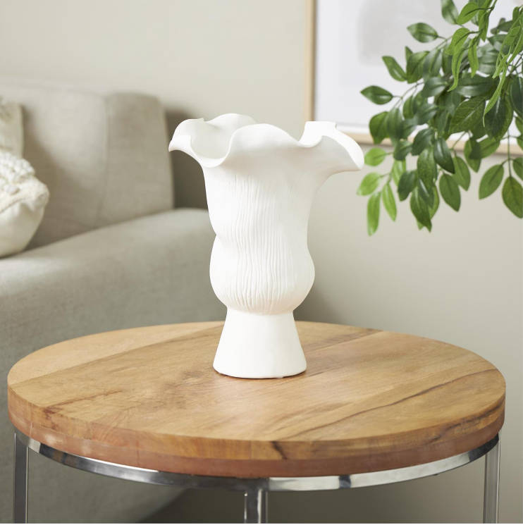 This ceramic vase boasts abstract floral inspirations and linear grooves, making it a perfect addition to any modern decor setting