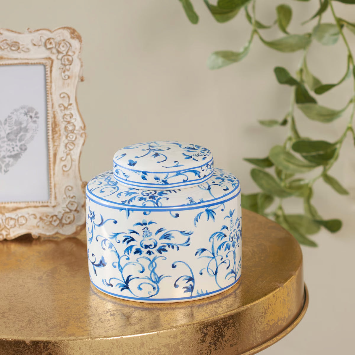 4" x 4.5" Bring timeless elegance to your space with this Small Indigo Tea Jar. Featuring rich indigo tones and delicate floral accents, it's a charming addition to any home décor collection.
