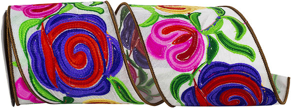 4" x 5 Yards Floral Embroidery Stitches Wired Edge Ribbon. Featuring colorful floral embroidery on a multi-hued background, this 4-inch-wide ribbon combines eye-catching design with wired edges for easy shaping and structure. Perfect for creating full bows, layered loops, and sculpted accents that hold their form, it’s ideal for wreaths, garlands, gift wrapping, and both seasonal and everyday decorating.