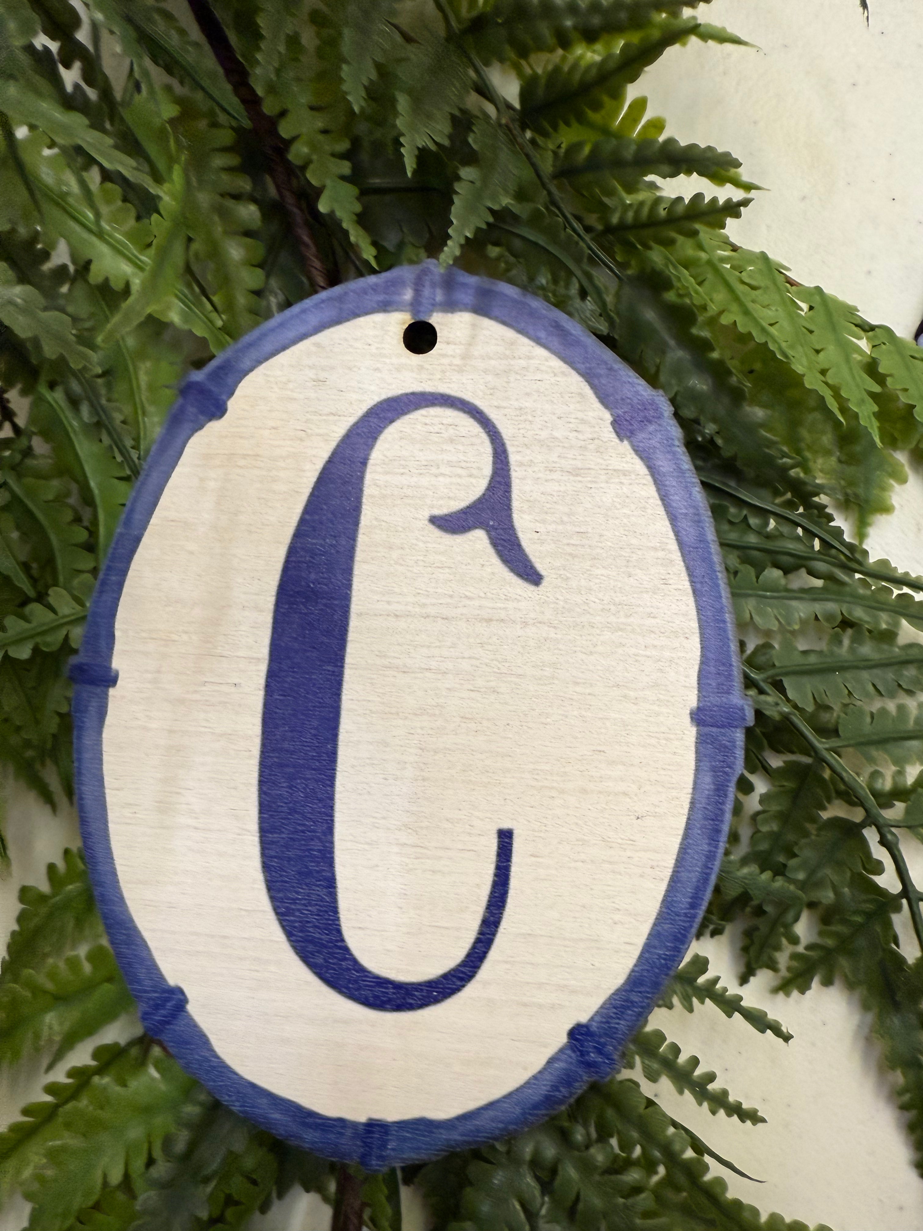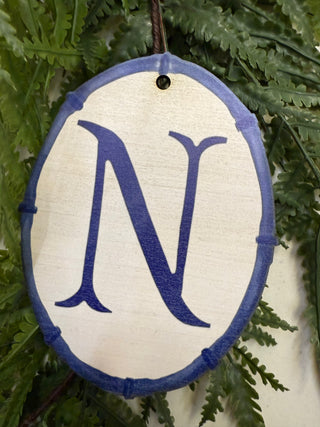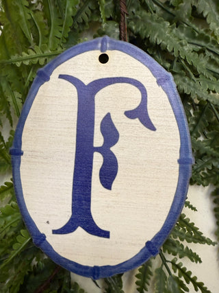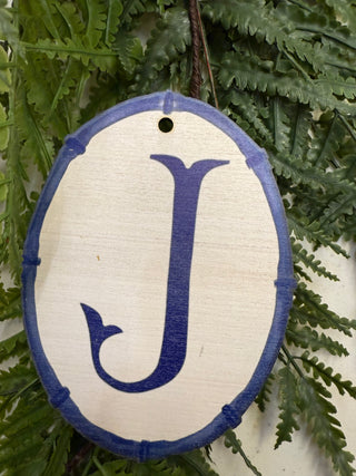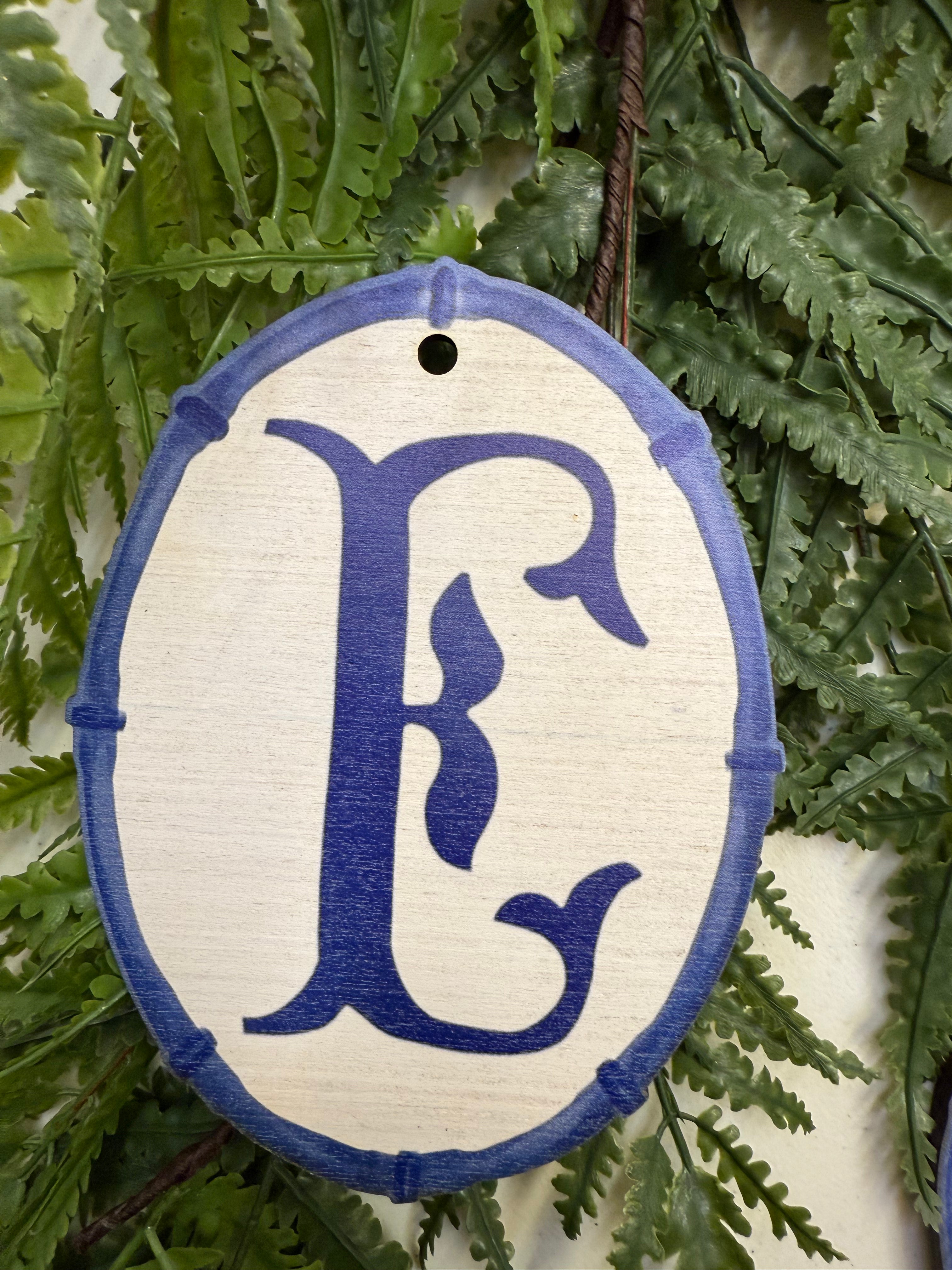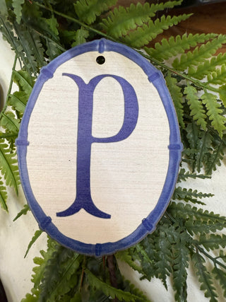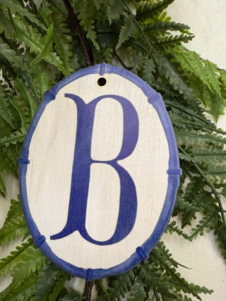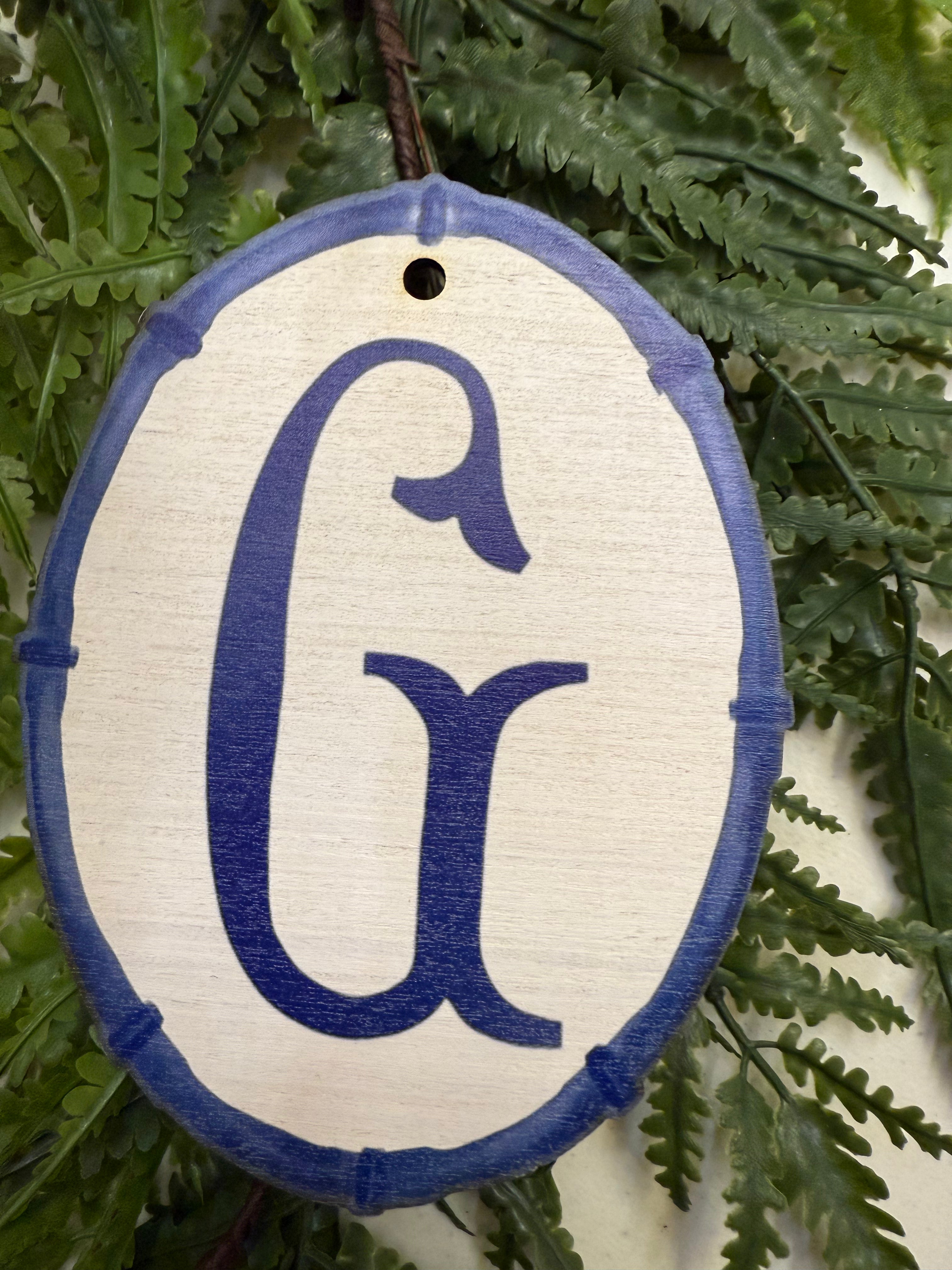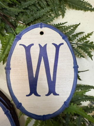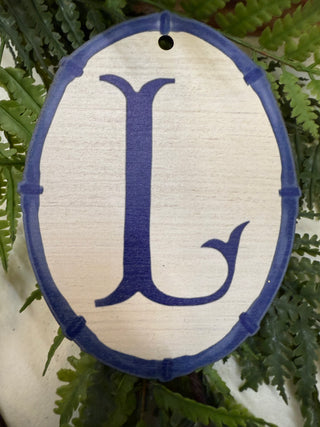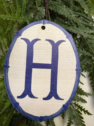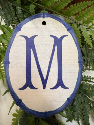 A charming way to personalize a bow, gift or greenery. This 6"x5" wooden ornament features a classic monogram bordered with a bamboo design. Hole pre-drilled for easy hanging.