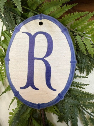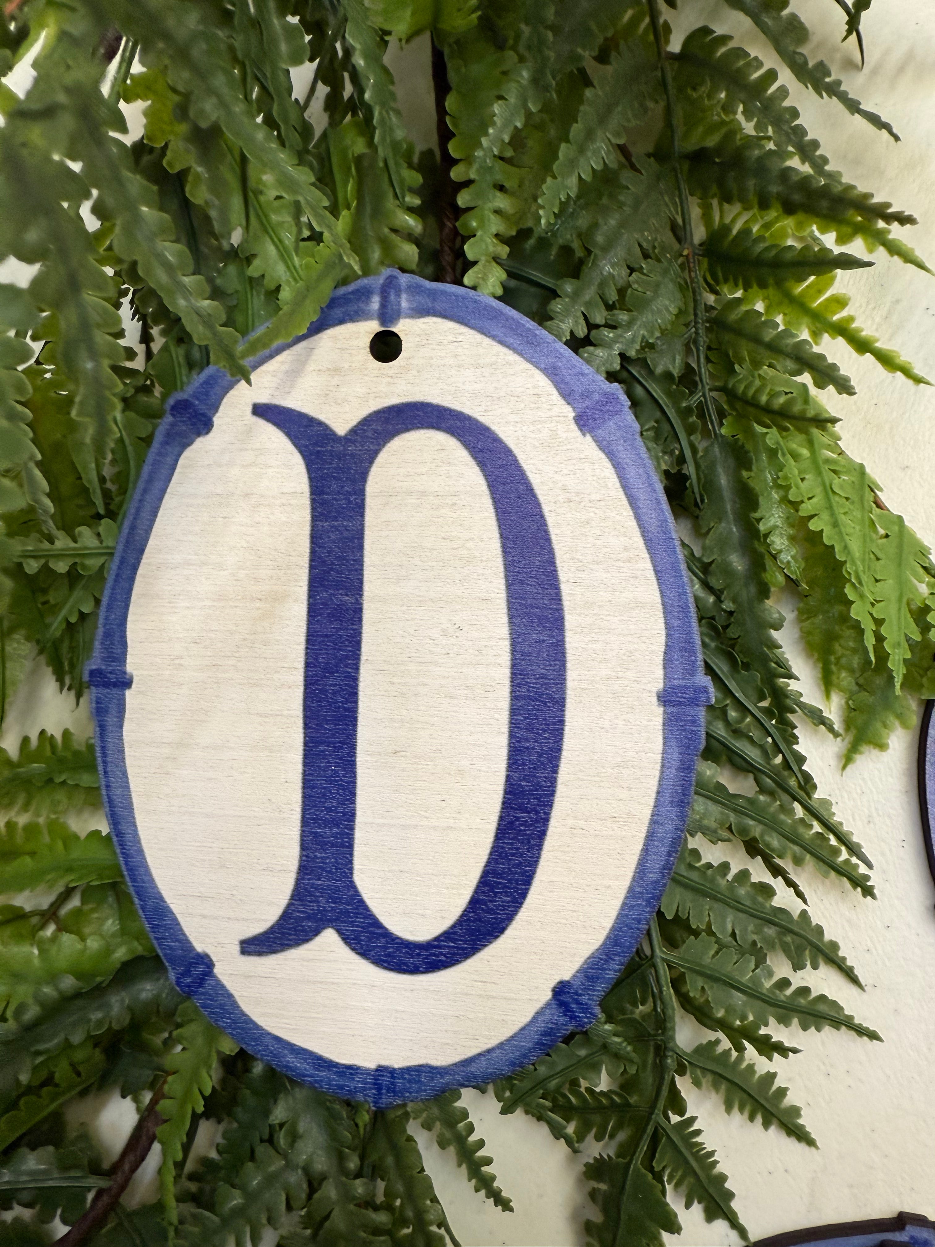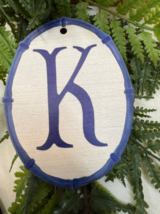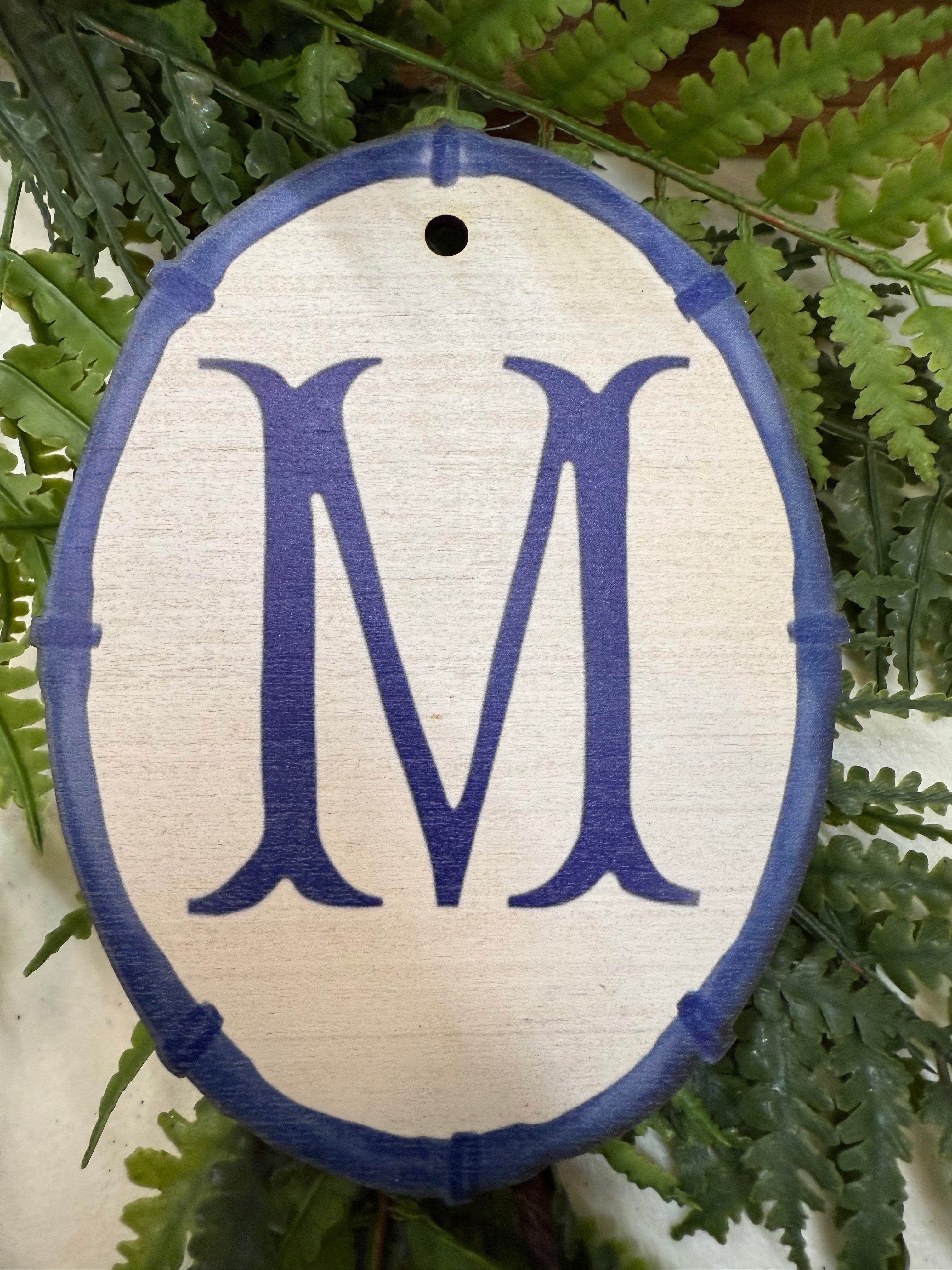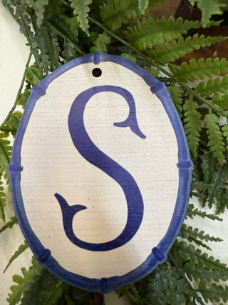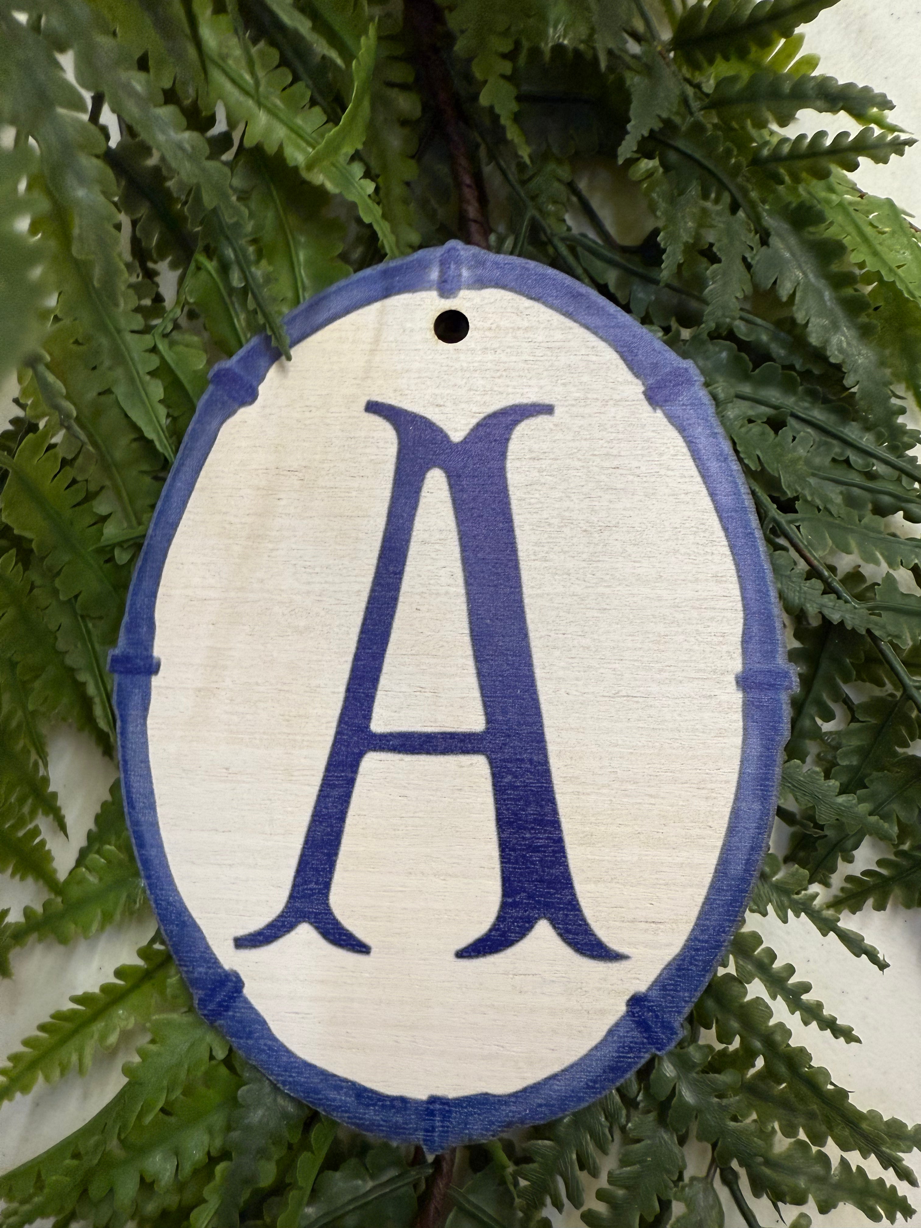 A charming way to personalize a bow, gift or greenery. This 6"x5" wooden ornament features a classic monogram bordered with a bamboo design. Hole pre-drilled for easy hanging.