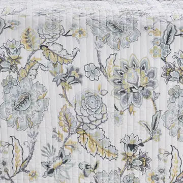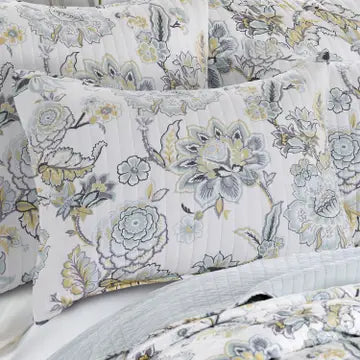 The Ophelia Reversible Quilt Set by Levtex Home is inspired by a beautiful garden of spa color floral vines. Offered in a grey, taupe, cream, color palette with spa blue, this design will immediately transform your bedroom. This reversible quilt features an elegant array of blooming floral vines on a cream ground on the front, reversing to a classic solid gray on the back. The Quilt Set has a rayon front and cotton back, filled with a cotton-rich filler, and is machine washable. Enjoy this for years to come!